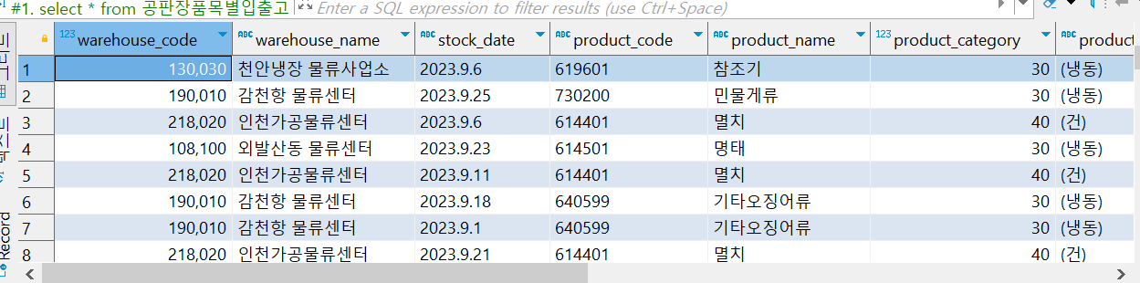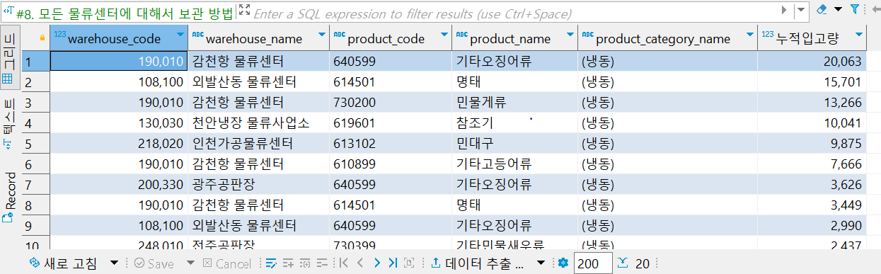 5. select warehouse_code, warehouse_name, stock_date, product_code, product_name, sum(inventory_quantity) from 공판장품목별재고현황