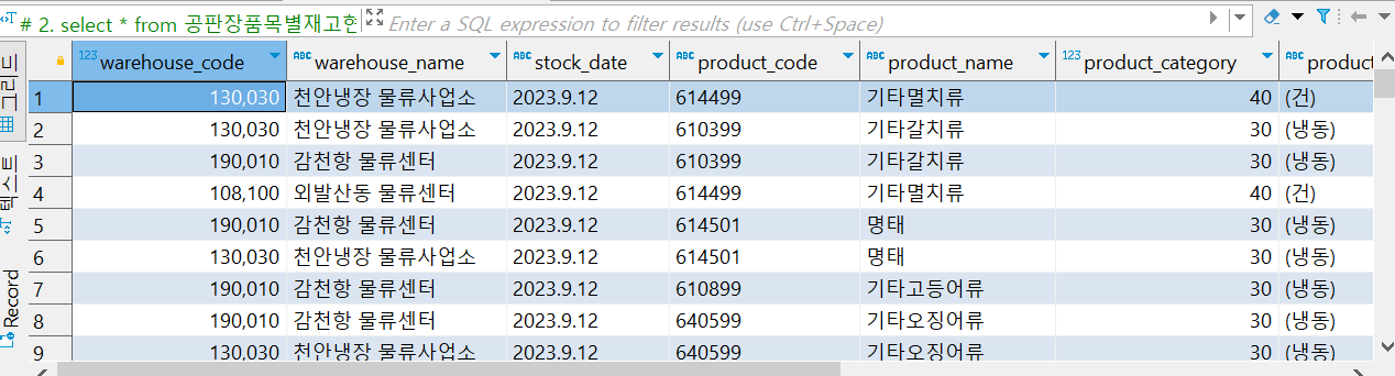 2. 공판장품목별재고현황 데이터 중 기준일자가 "2023.9.12"인 데이터를 조회하세요 (재고량이 높은 순서대로)